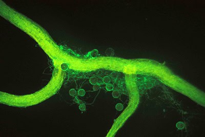 The world mycorrhiza comes from the Greek words for fungus and root. Mycorrhiza inhabit the rhizosphere, the zone of soil immediately surrounding the roots. There are several categories of mycorrhizal fungi; the one usually associated with agricultural and horticultural crops are arbuscular mycorrhiza (AM). This type grows into the roots themselves, developing tree-like branched structures called arbuscules where nutrients are exchanged. The hyphae, or branchlike structures of the mycorrhiza actually increases the reach of the roots, extending further out into the soil and absorbing and bringing back nutrients. In return, the mycorrhiza receive carbohydrates from the plant that it cannot produce on its own.