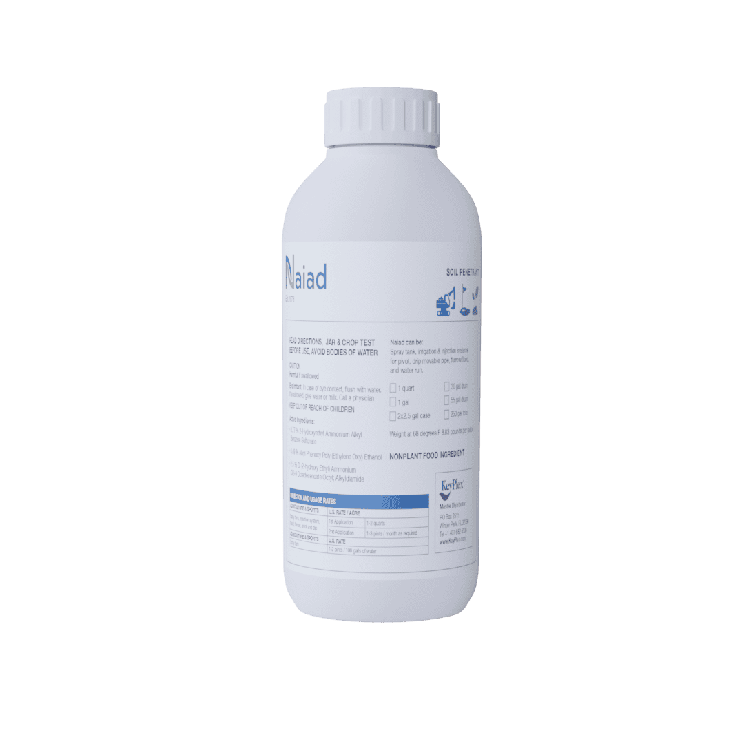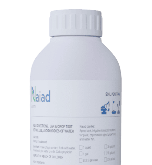 Naiad is a professional-grade water penetrant and soil dispersant designed to reduce surface tension and help water infiltrate deeper into the soil. It promotes even water distribution and maximizes irrigation efficiency in agricultural settings.