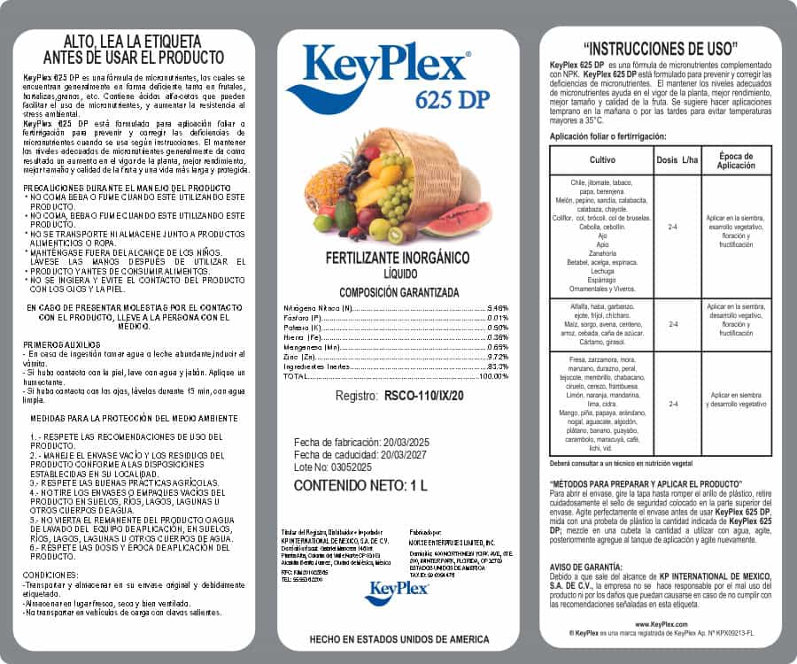 Developed for use on citrus, tropical fruits, stone fruits, pome fruits, nuts grapes, and corn or other row crops KeyPlex 625 DP is a formulation of micronutrients most often found deficient in citrus trees, other fruit trees, nut trees and corn. It contains alpha-keto acids, which may facilitate utilization of micronutrients, and increase resistance to environmental stress.