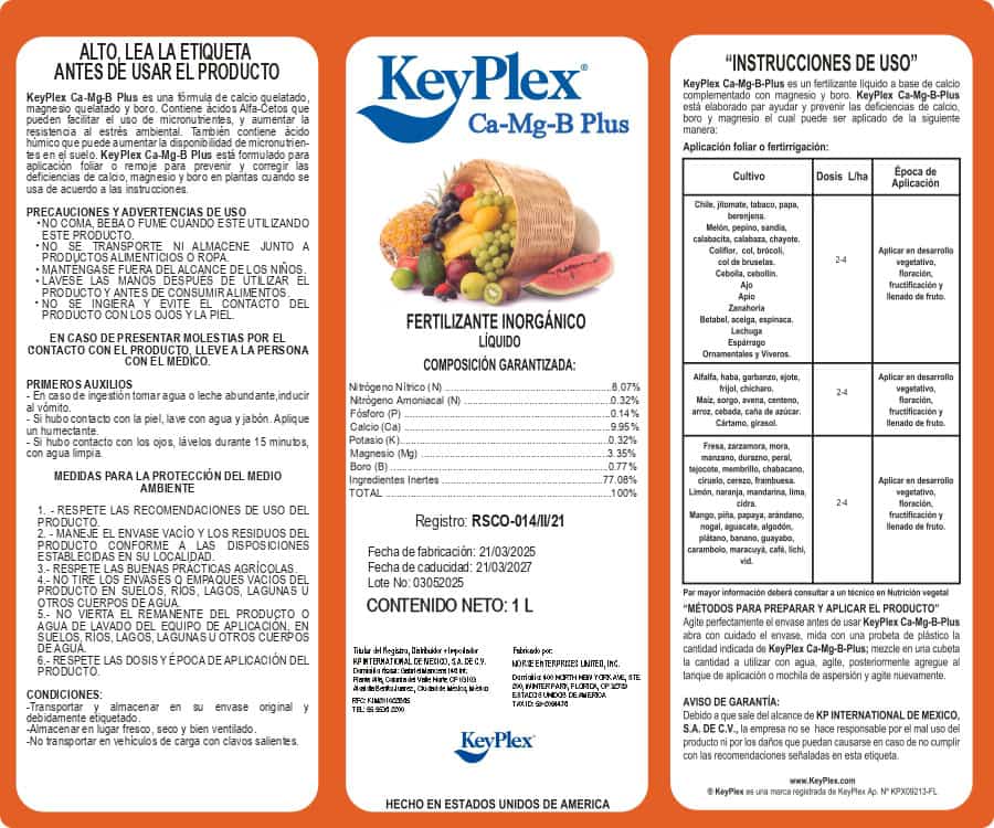 Citrus, tropical fruits, stone fruits, pome fruits, and nuts Use 2 to 3 quarts of KeyPlex Calcium- Magnesium-Boron Plus per acre per application in a minimum of 50 gallons of water.